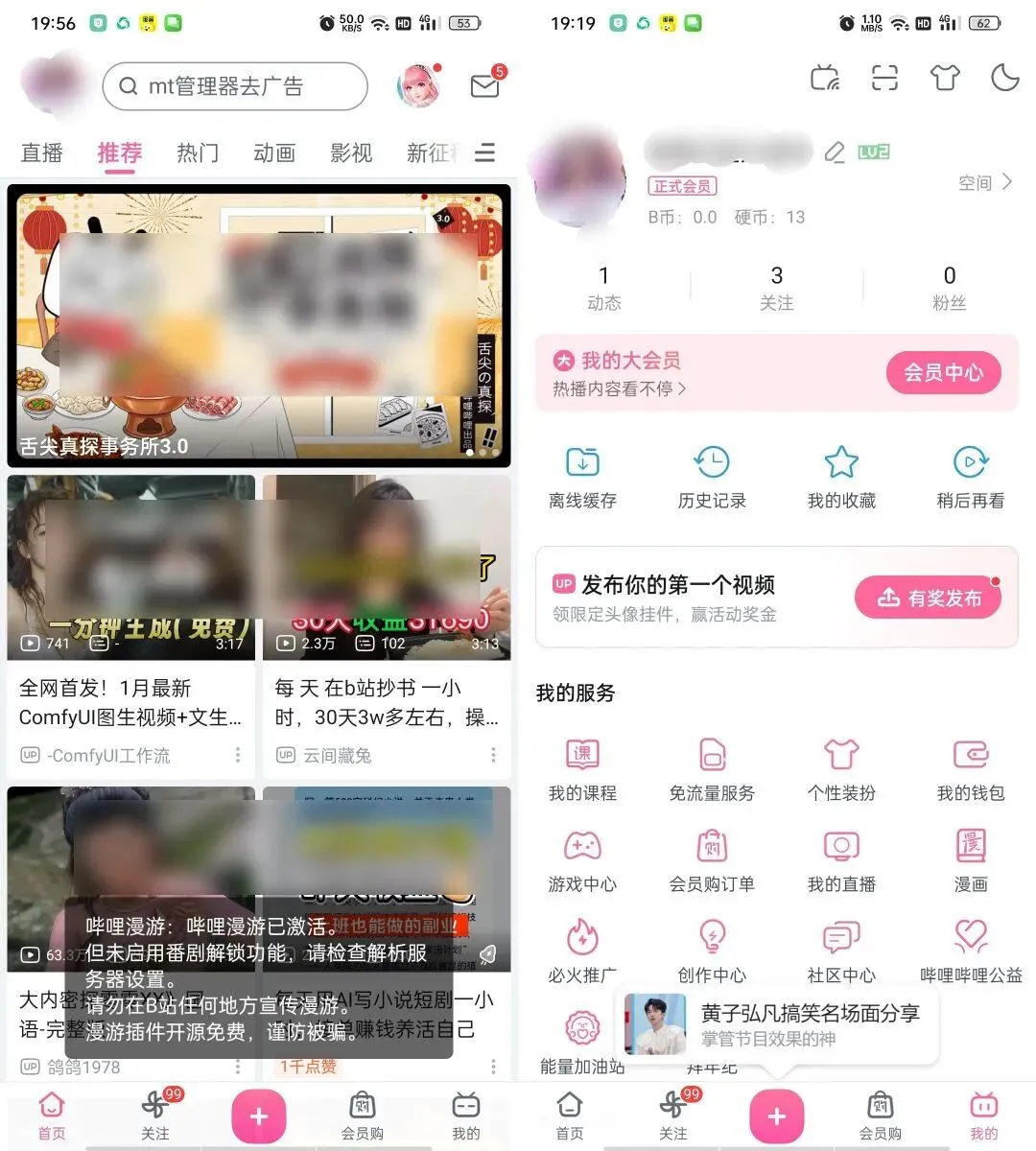 **简介:(点我的–漫游,开启) 哔哩是中国领先的年轻人文化社区和视频平台。此版本内置了插件,提供更纯净、自由的观看体验,但非官方应用。使用核心功能需要手机号登录。