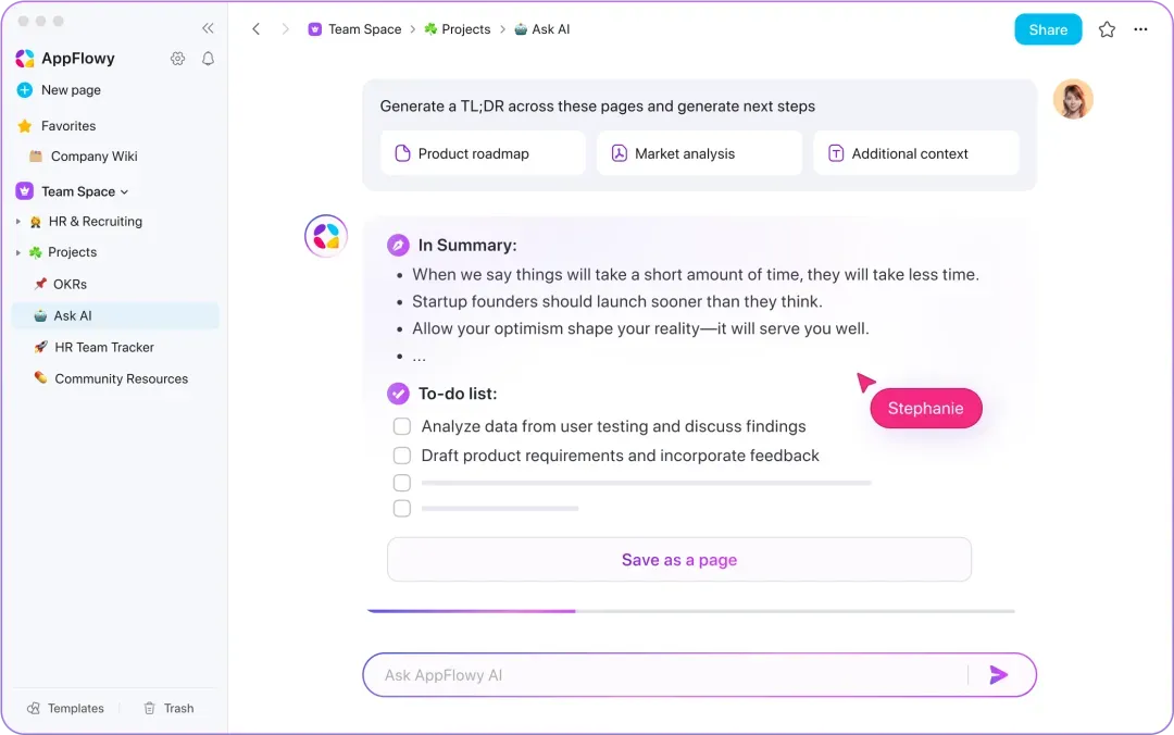 AppFlowy凭借其优秀的设计理念和强大的功能,为用户提供了一款革命性的笔记和任务管理工具。通过数据隐私保护、高度可扩展性、稳定的原生体验以及多平台支持,AppFlowy不断满足用户的需求,帮助他们实现更高效的工作流程。在信息安全和个性化的双重需求下,AppFlowy值得每一位寻求高效管理工具的用户尝试。