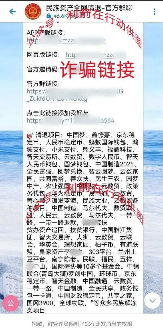 提醒:“民族资产清退”APP是打着“国家项目”旗号的民族资产解冻类诈骗项目,涉嫌传销活动,发“清退款”是假,诈骗洗钱才是真!