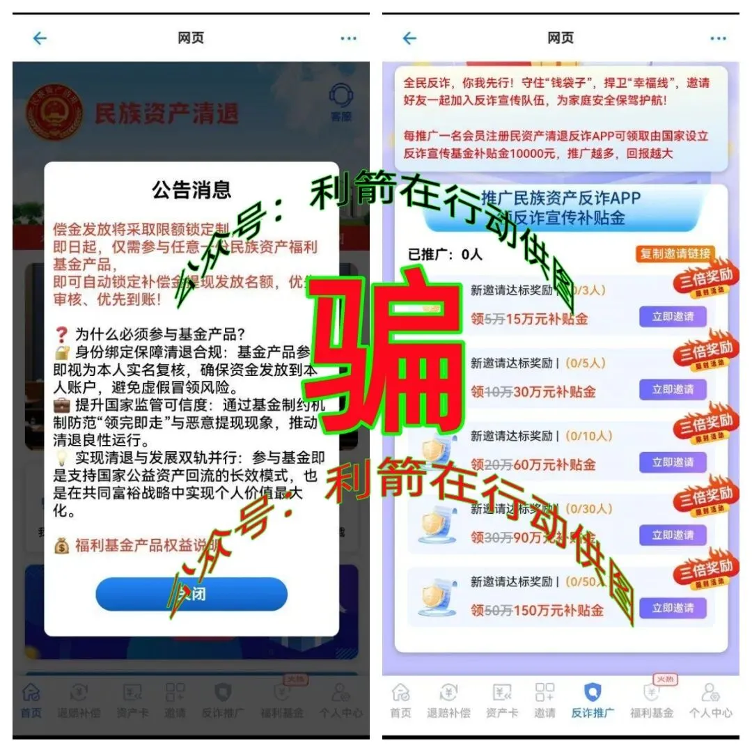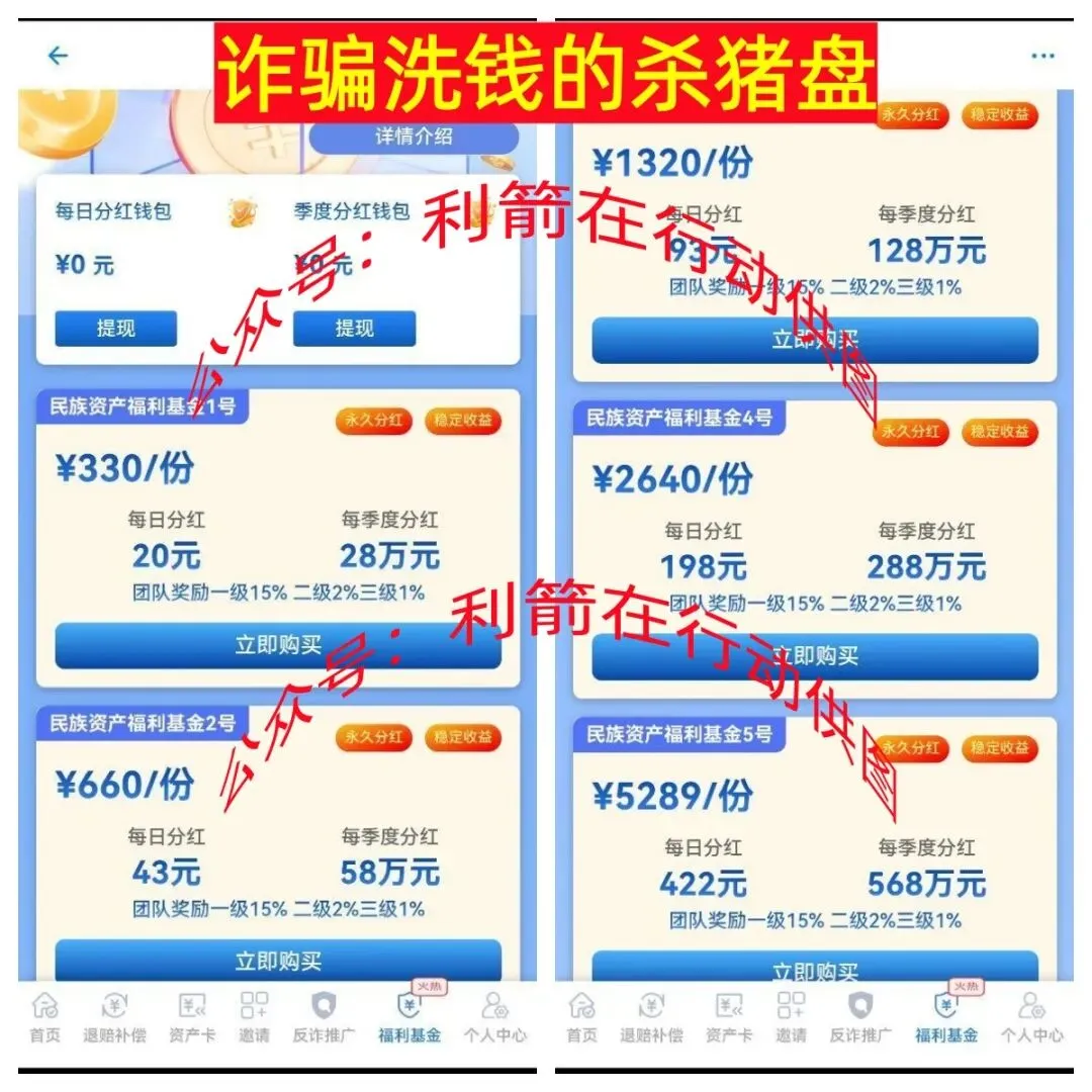 打着“反诈骗”旗号的“民族资产清退”APP中谎称,想拿到“清退款”,必须要参与任意一款基金产品,还蛊惑参与者拉人进去交身份信息注册,交钱“投资”,这种不合逻辑的拉人交钱,明显就是让更多人入坑被收割!