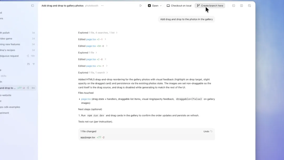 在一个项目里同时开好几个线程,让 AI 帮你 写代码 / 改 Bug / 做文档。每个线程都独立,你可以随时 切换查看、评论,并决定是否合并到本地。