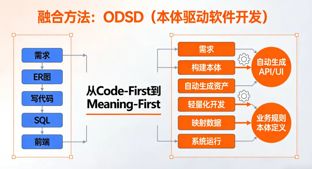 ODSD 开发 (Meaning-First):需求 -> 构建本体 -> 自动生成基础资产 -> 轻量化个性化开发 -> 映射数据 -> 系统运行。