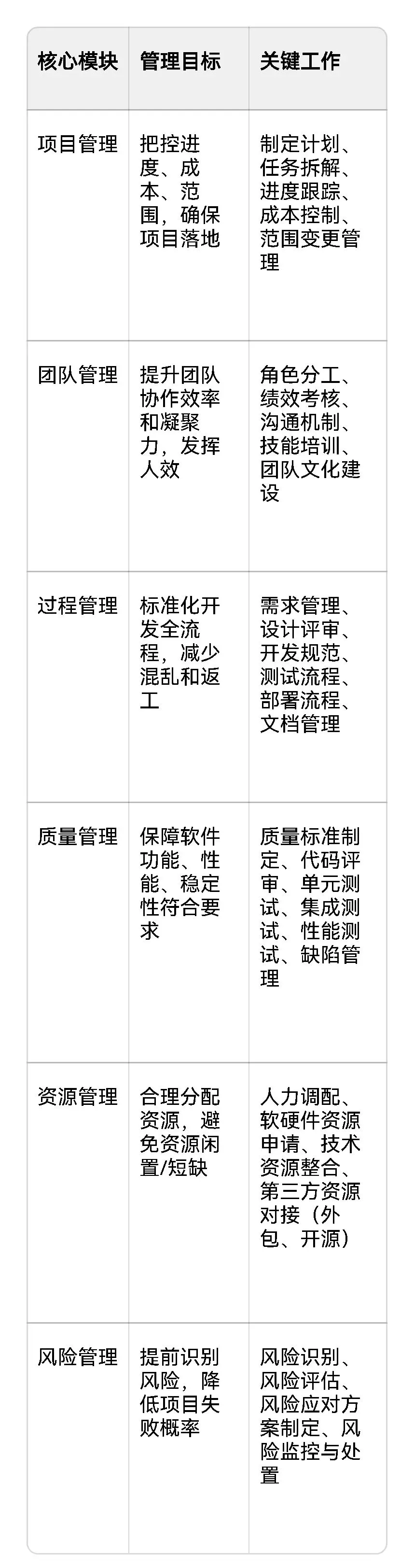 一、软件开发管理的核心框架(4大维度+6大核心模块)