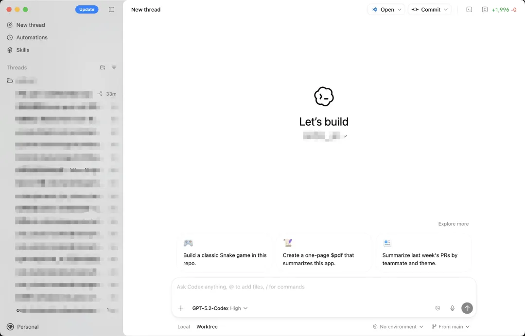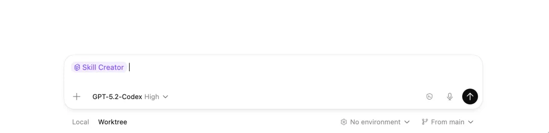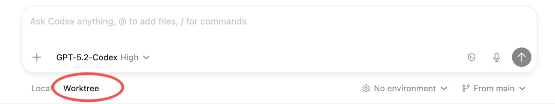 中间是对话和工作区,底部可以切换 Local 和 Worktree 两种模式,还能选模型(默认是 GPT-5.2-Codex High)和执行环境。