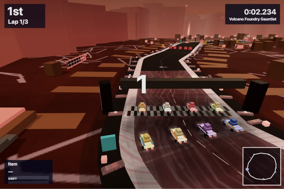 这个游戏有 8 个不同的赛车手、8 张地图、还有玩家可以用空格键触发的道具系统。
