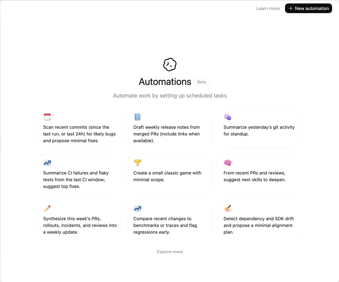 甚至还有个骚操作:用 Automations 来定期自动创建新的 Skills。对,让 Agent 自动生产 Agent 的能力。