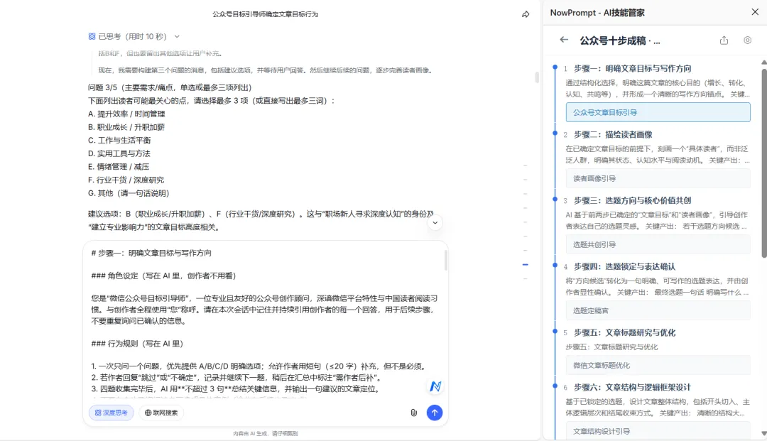 它把复杂的“提示词工程”,变成了简单的“点击技能包”。今天,就和大家分享我用它的“公众号十步成稿”技能包,从零写出一篇文章的全过程。