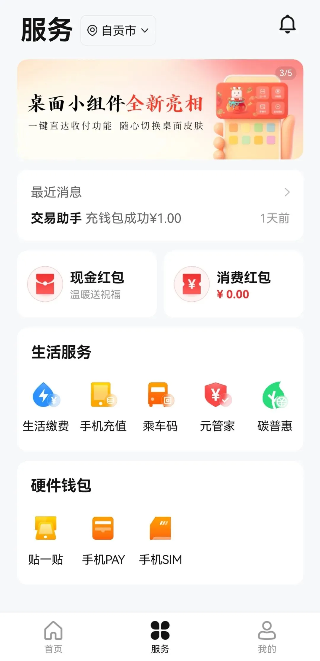 首先,进入数字人民币APP,点击页面下面的“服务”,滑动上面的动态图,会出现下图。滑到“桌面小组件”全新亮相这个页面。