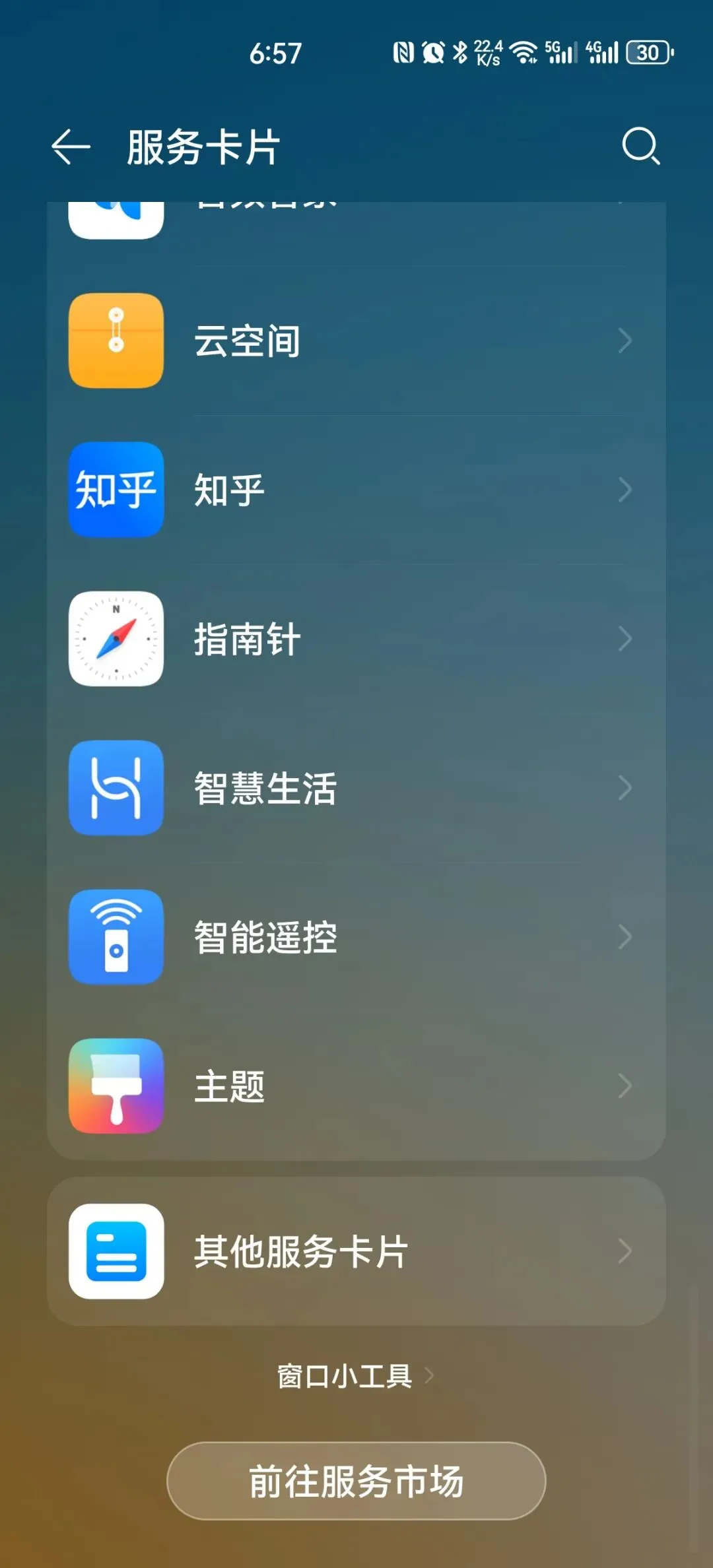 点击“服务卡片”。然后一直向下移动,直到看到最后才出现下图的“窗口小工具”: