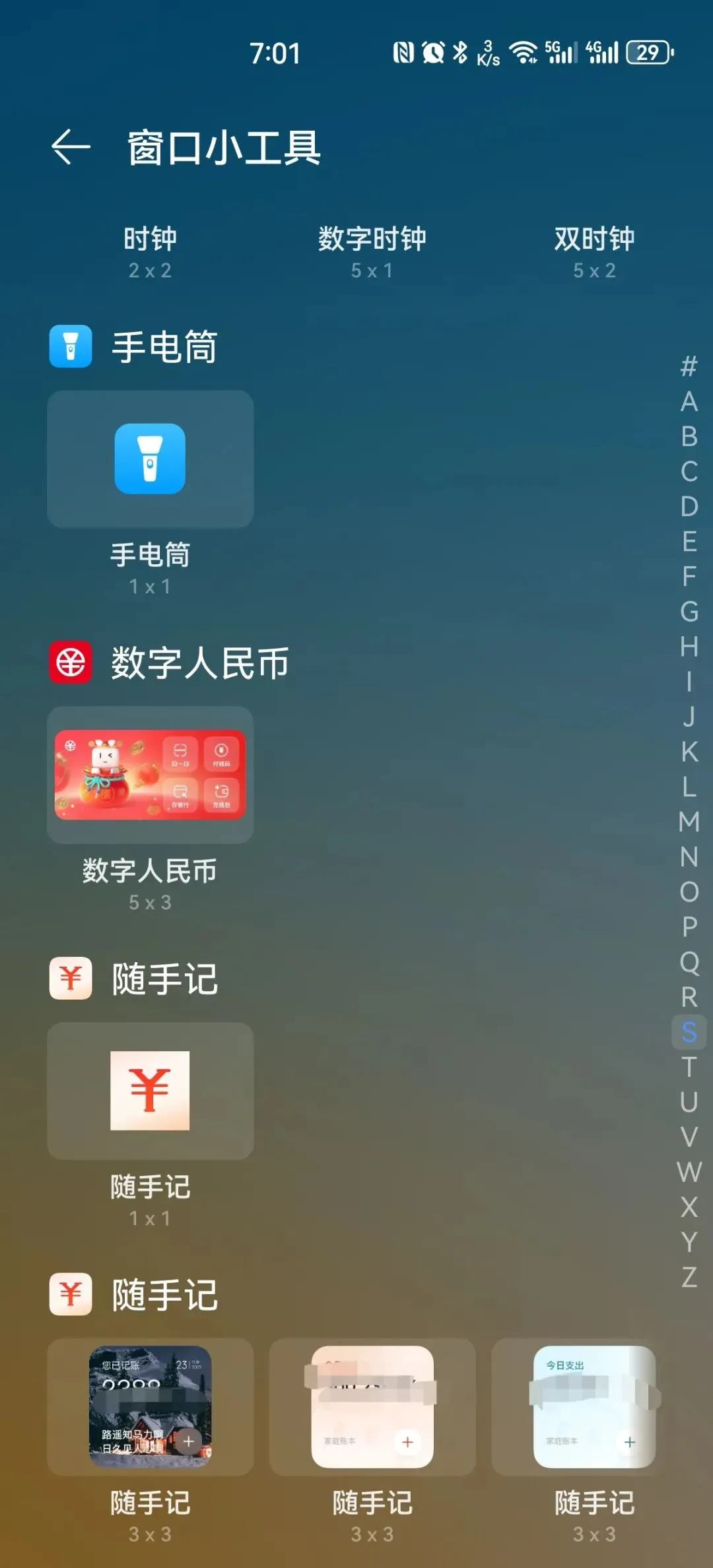 点击“窗口小工具”,出现你已经安装的各种程序,找到数字人民币APP图标(在这里找这个APP比较方便,右侧有字母,点击字母“S”,很快就找到了数字人民币APP):