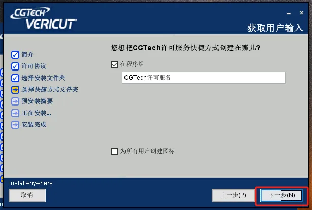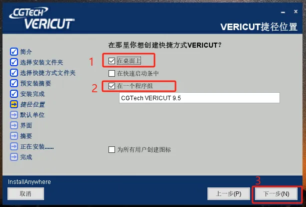 第十一步:勾选【在桌面上】和【在一个程序组】,然后点【下一步】。