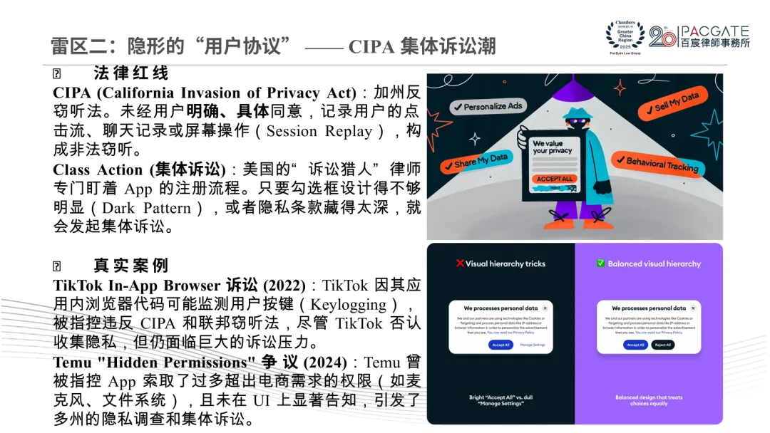 用户隐私协议与数据收集的合规风险,尤其是美国加州《反窃听法》(CIPA)引发的集体诉讼浪潮。