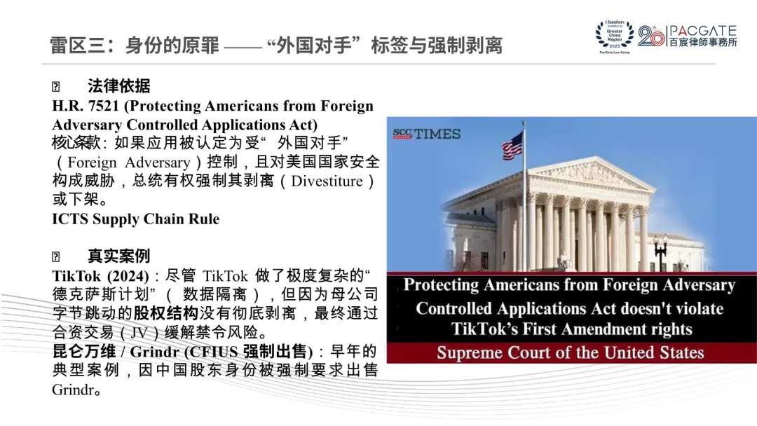 中国出海企业面临的 “身份原罪” 风险,也就是仅仅因为 “外国对手” 的标签,就可能被美国政府强制剥离业务或下架产品。