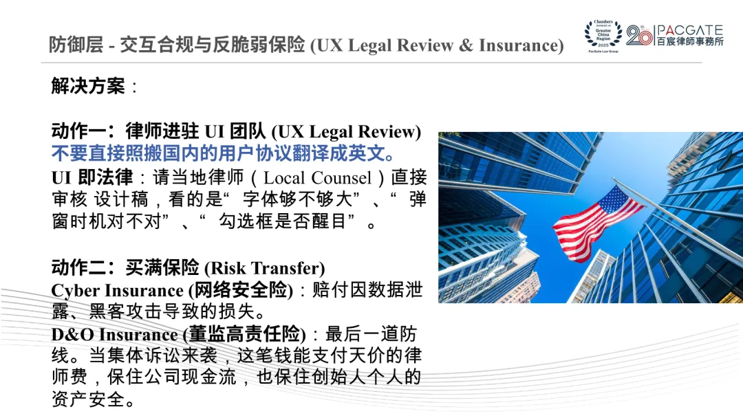 如何通过 “交互合规” 和 “风险转移” 两大动作,为企业建立一道坚实的缓冲带,来应对美国的集体诉讼和监管冲击。两大防御动作