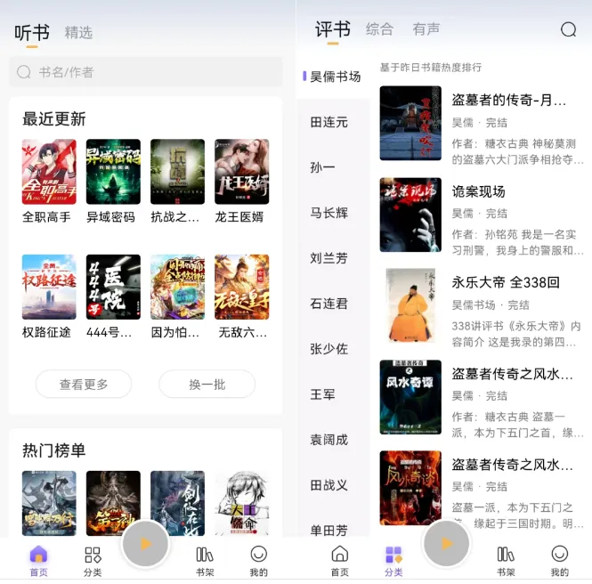 以上更新的几款听书APP,很多书源都是来自喜马,并且是真人主播朗读,支持定时、倍速等功能,体验感非常不错~这四款软件各有特色,但共同点是都能让你享受到免费的听书乐趣。