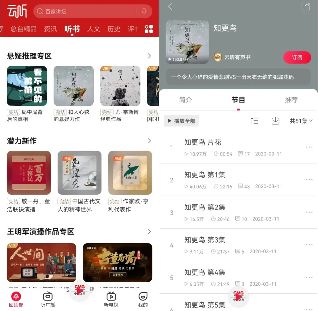 云听这款APP是小莓最喜欢用的听书软件,主要有三个点:界面美观、书源多、听说体验好。云听也凭借强大的书源收集能力,深受用户喜欢,9999+的书源,持续更新。云听内自带各种榜单、热门分类、热门小说资源等,都市、科幻、言情、玄幻等书源应有尽有,最主要是基本都免费~更别提它那强大的搜索功能,让你轻松找到想听的书。离线下载功能也是棒棒的,没有网络也能畅听无阻。