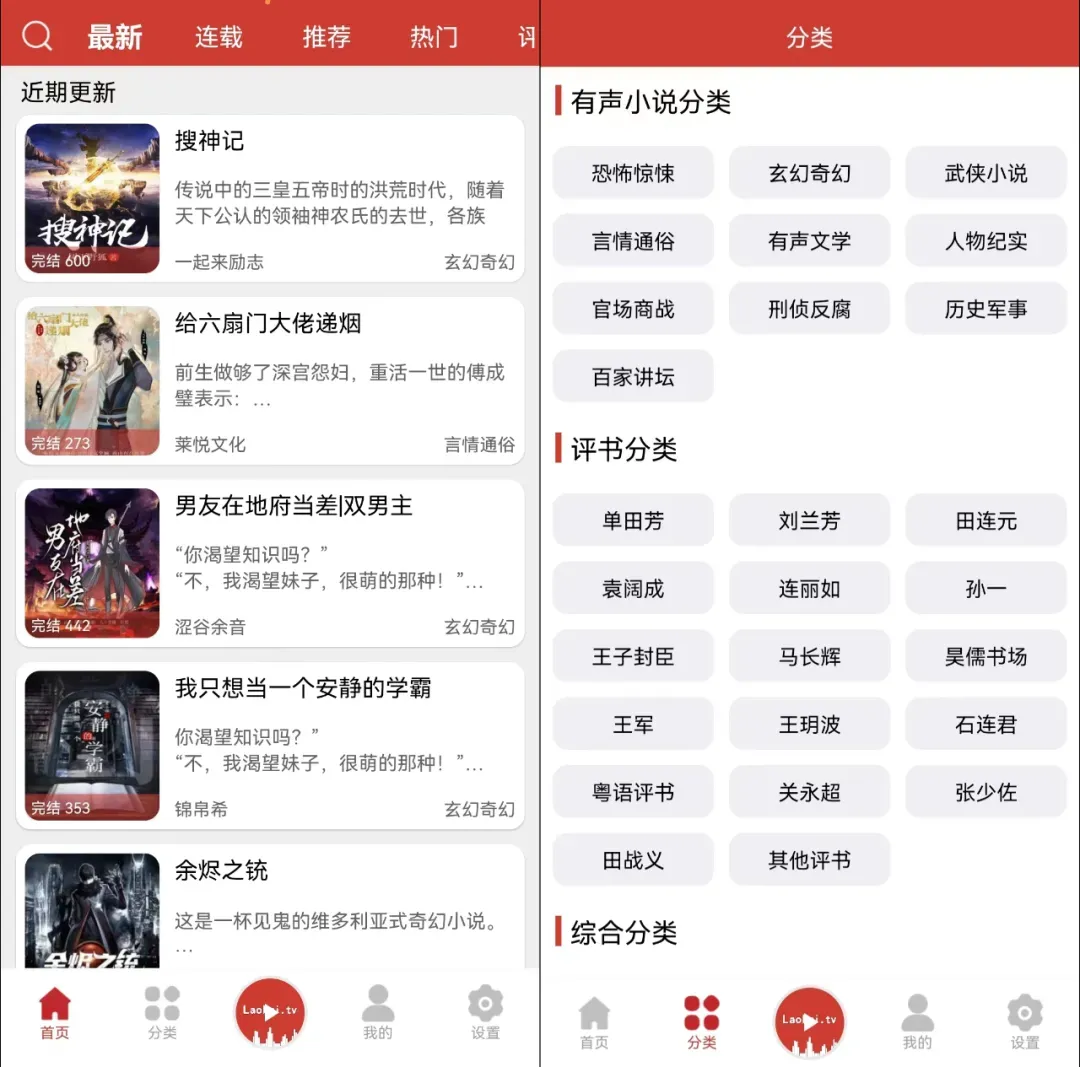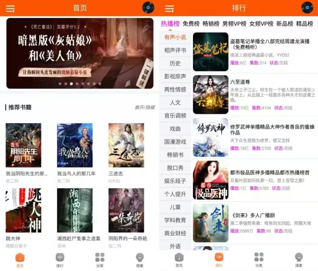 这是我觉得最有情怀的一款听书APP,因此这款软件除了海量热门的网络小说听书资源外,还有大量世界名著可以免费听书,比如《红楼梦》、《三国演义》等名著都可以进行听,且该APP中的配音都是资深配音老师,非常生动有情怀的给你讲书,能有身临其境的感觉,且分类清晰的,很便于搜索。