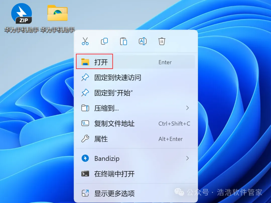 7、回到桌面,右键桌面上的【华为手机助手软件图标】,点击【打开】