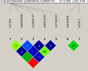 (其中方框里的数值代表D值,D值在80-100表示两位点高度连锁不平衡,在20-80表示中度的连锁不平衡,<20表示两位点间无连锁不平衡。)