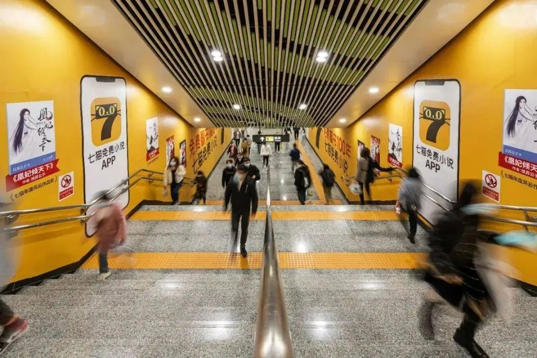 流水的综艺节目,铁打的七猫免费小说。近两来七猫免费小说营销可以说无孔不入,消费者想不印象深刻都难。左手《王牌对王牌》,右手《向往的生活》,各大城市的地铁站也“沦陷了”,大大的logo,显眼的“黄色”主题色,占据着地铁站所及之处大量的篇幅,除此之外,短视频平台亦是其实施营销战略的重要阵地,主要方式是用短剧的方式来演绎热门小说剧情片段。
