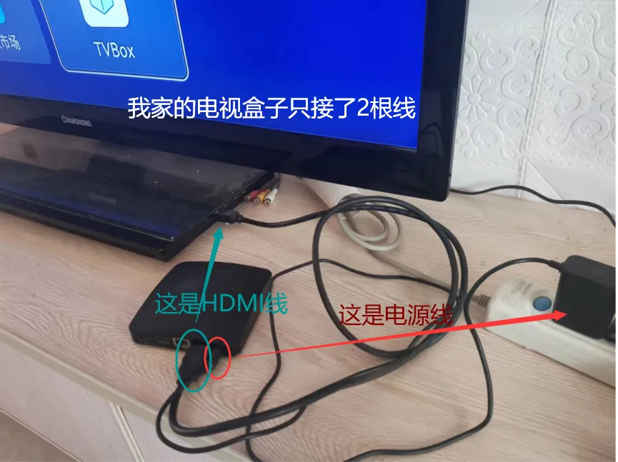 新电视连接电视盒子的接线如下图所示,用的是HDMI线。