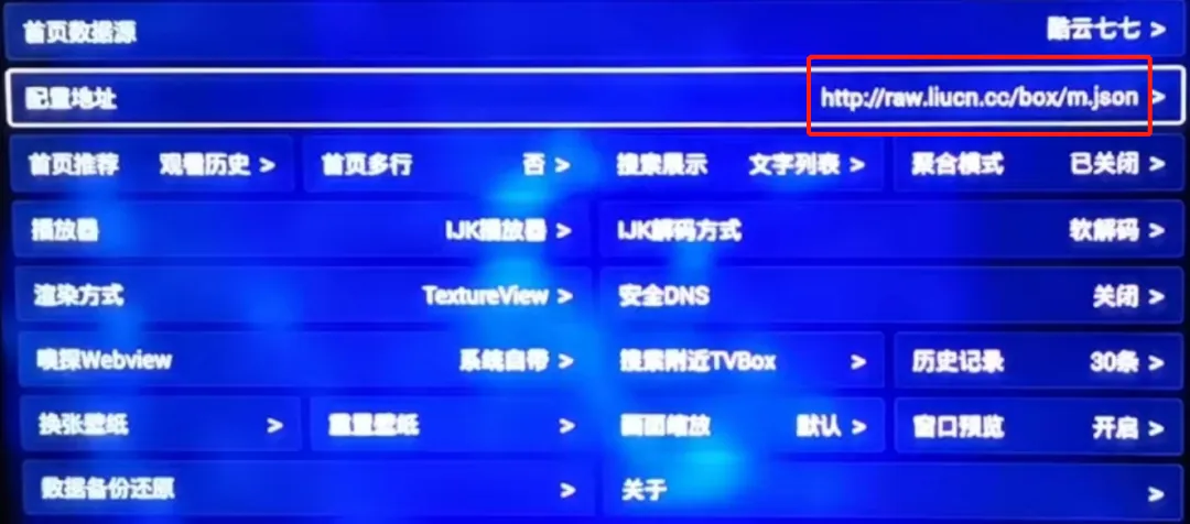 安装包里我提供了1个全局接口网址列表,每个网址都对应1个视频源配置文件,背后都是1个高手在运维。嫌麻烦就跟我家一样设置就行了,如下图所示。