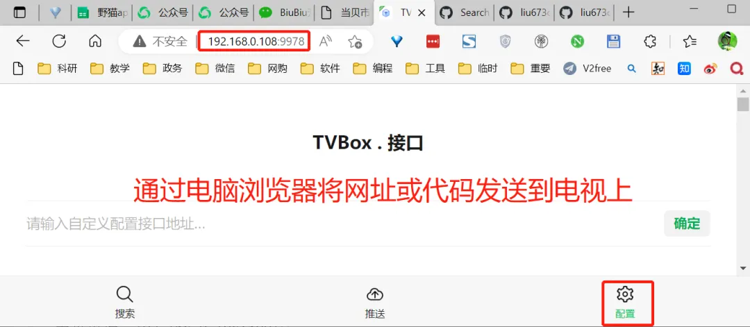 配置地址时,可以手动输入网址,这样很费时间;也可以根据屏幕提示,使用软件自带的远程推送功能(与前文当贝市场的一样),用电脑浏览器打开指定网址(比如192.168.0.108:9978),然后将列表中任一网址(比如https://raw.liucn.cc/box/m.json)直接发送到电视上。