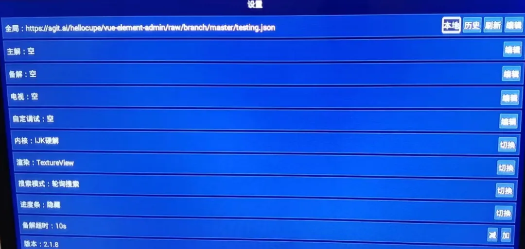 BiuBiu新版被作者改名为了“调试助手”,它的用法跟TVBox大同小异,也是先安装,然后修改全局接口的网址(即配置地址,比如https://agit.ai/hellocupe/vue-element-admin/raw/branch/master/testing.json),如下图所示。