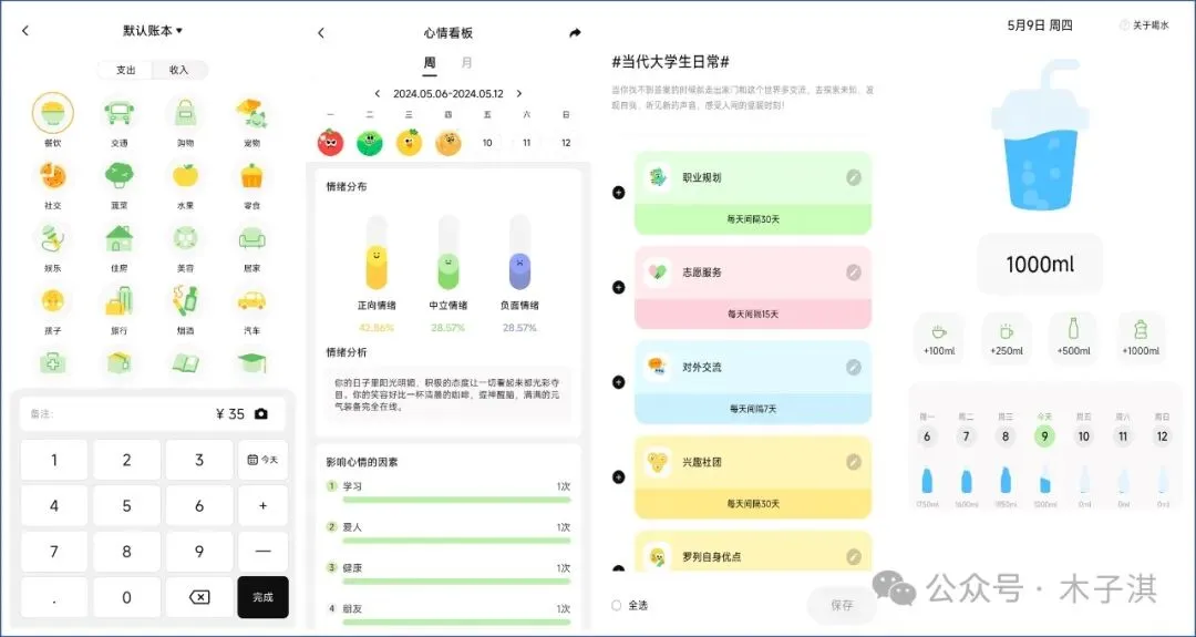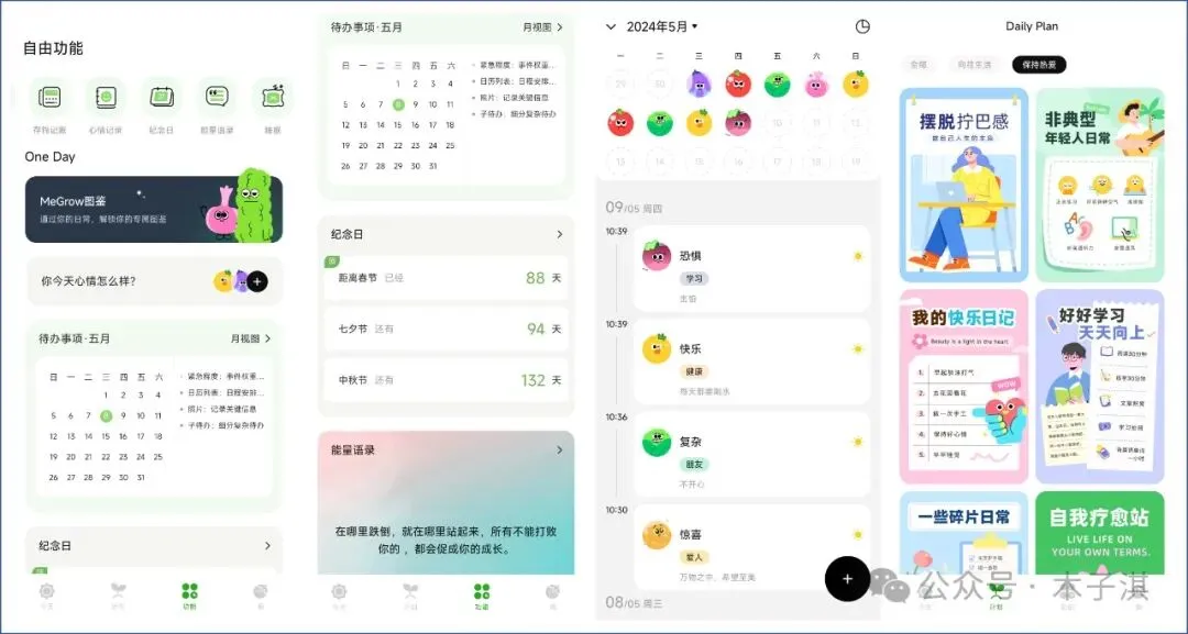 它目前是完全免费的,所有功能目前都是免费使用,画风可爱清新,每个界面都让人赏心悦目,支持的功能包括:目标打卡、待办事项、番茄专注、记账、心情记录、纪念日、能量励志语录、睡眠记录、高效计划、每日喝水记录、每日步数记录、每日热量消耗等。