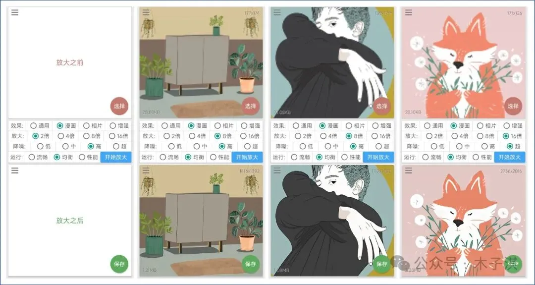它支持通用、漫画、相片、增强 4 种放大处理效果,每种放大效果都对图片的色彩边缘和细节进行处理,支持导入 PNG 和 JPG 格式图片,只需要很简单的操作,就可以实现图片无损放大。