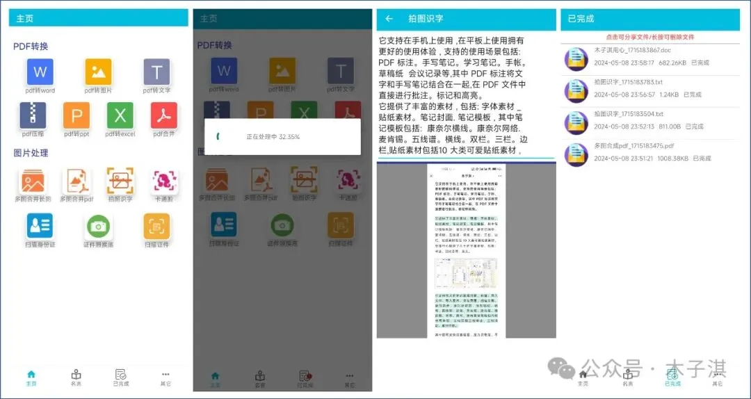 它支持的功能包括:PDF 转 Word 、PDF 转 Excel 、PDF 转 PPT 、PDF 转图片、PDF 提取文字转 TXT 、PDF 压缩、PDF 合并,还支持拍图识字、图片提取文字、多图合并长图、图片卡通化、证件照换背景色、文件扫描。