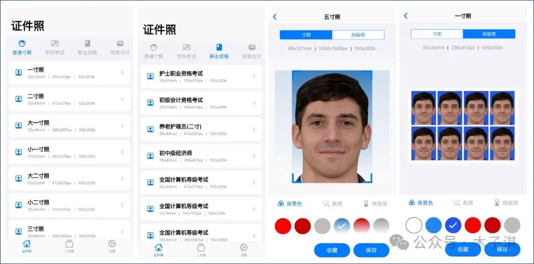 它完全免费,无需注册登录,没有乱七八糟多余的东西,所有数据离线存储,支持证件照分类功能包括:普通寸照、考试、职业资格、财务会计、公务员、计算机、医药卫生。