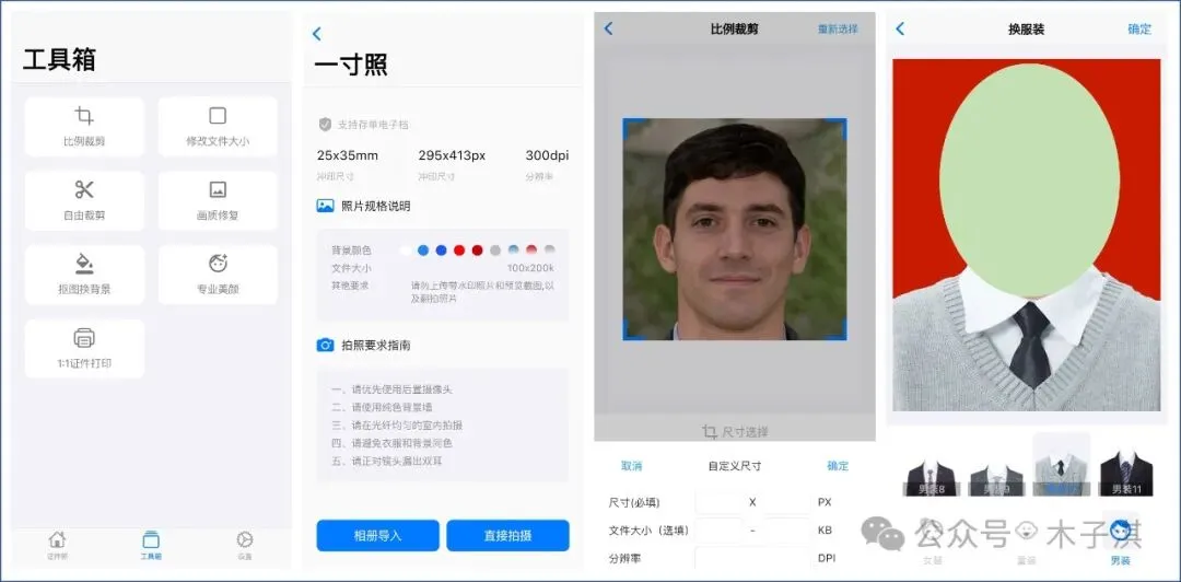 除了证件照制作功能,它还支持工具箱板块,包括:图片比例裁剪、修改图片大小和尺寸、自由裁剪图片、图片画质修复、图片变得更加清晰、图片抠图换背景,每个功能都是很实用。