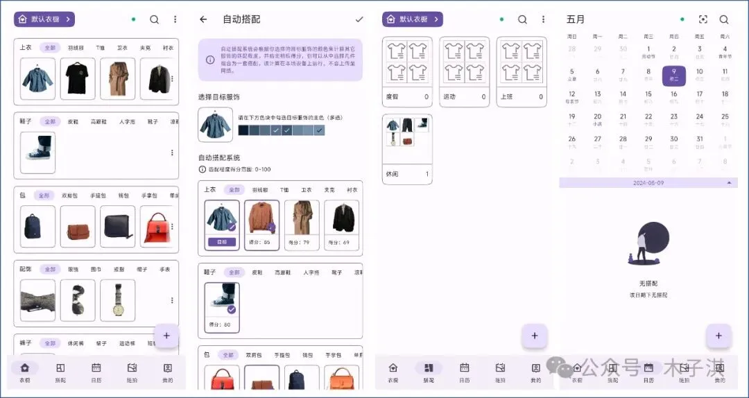 它小清新风格,颜值很高,简约好用,支持的功能包括:电子衣橱、自动搭配、穿搭日历、穿搭随拍、穿搭灵感、共享衣橱。