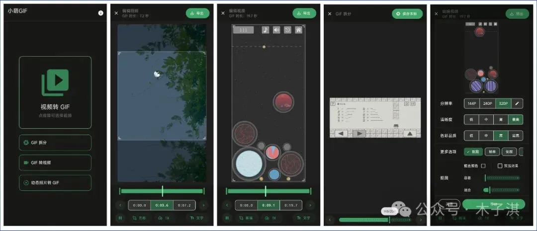 其中视频转 GIF 支持的功能包括:设置画面比例、设置播放速度、添加文字、设置分辨率、清晰度、色彩品质、帧率、倒放、结尾停顿、抠图。