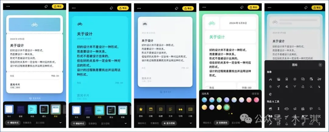 它目前支持 13 个精美模板,支持编辑设置的内容包括:图标、日期、标题、文本、引用、字数、二维码、水印、背景颜色。