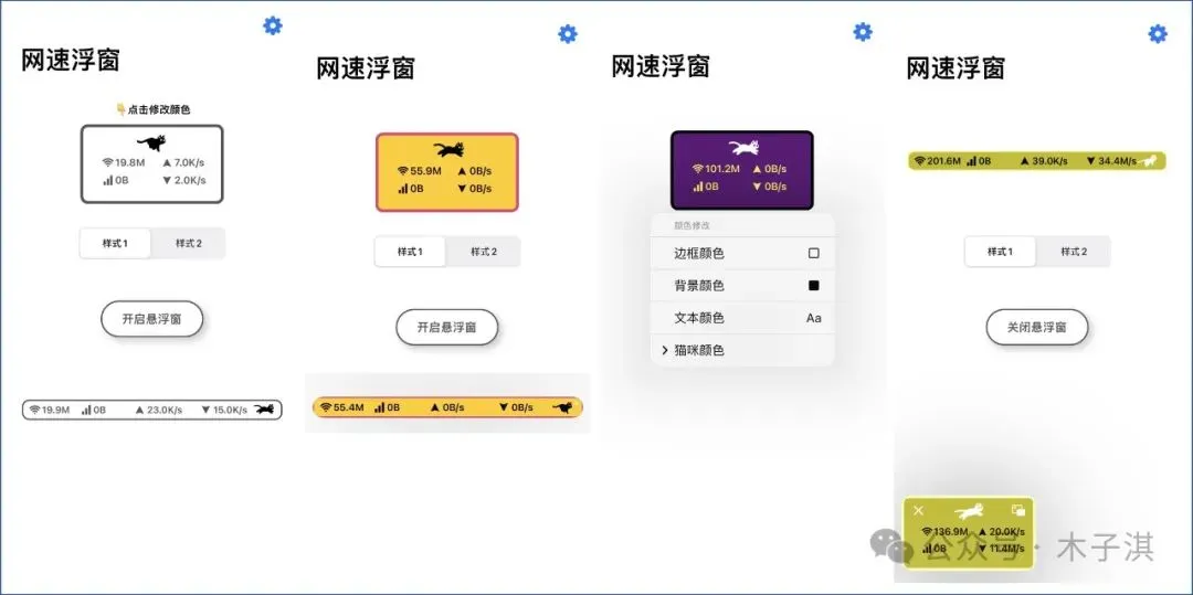 它支持设置边框颜色、背景颜色、文本颜色、猫咪颜色,其中小猫咪一直在动态跳跃,当实时网速很快,猫咪跳跃速度也会加快,非常有意思。