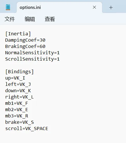 如果需要自定义操作按键以及鼠标速度,可以打开编辑软件文件夹里的 options.ini 配置文件,DampingCoef 数值越大,光标移动速度越慢。