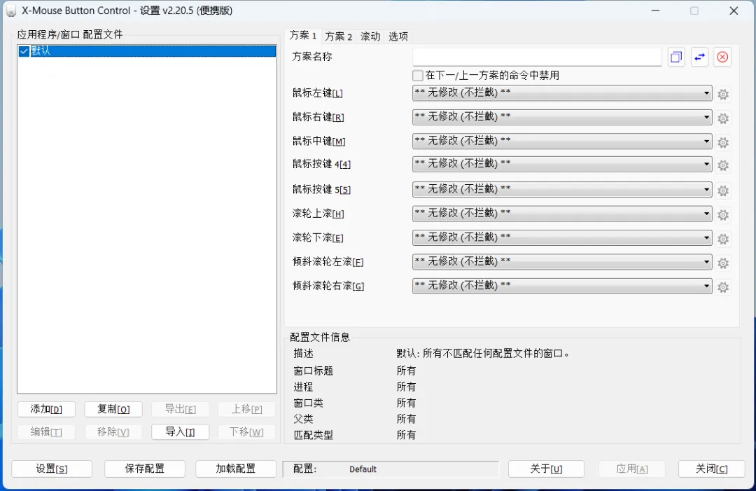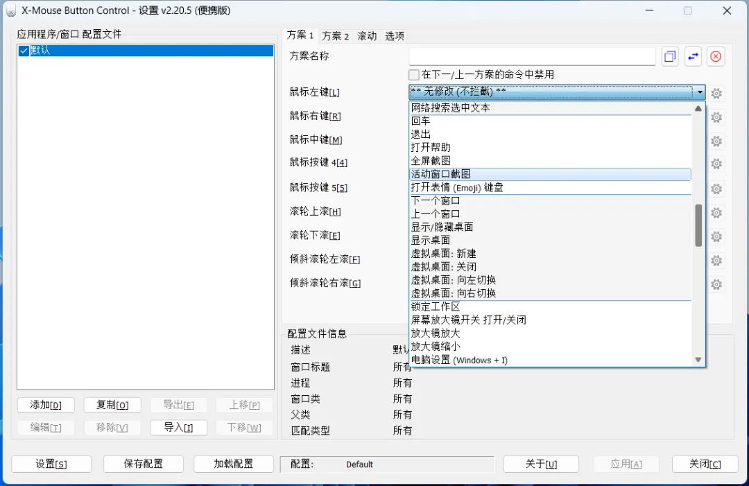 主界面右侧是方案设置,分别对应鼠标左键、右键、中键等按下时执行的对应操作。