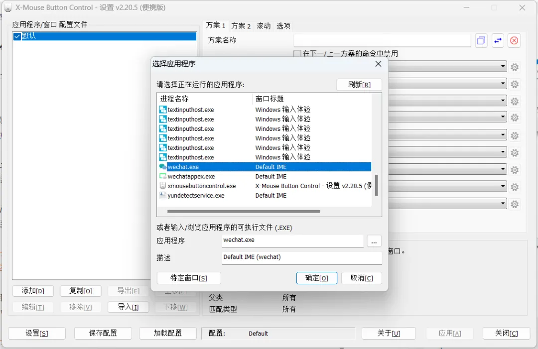 软件自带一个默认的配置方案,如果只需要在某特定软件下才启用映射,那么可以点击「添加」按钮之后,加入对应程序进程。