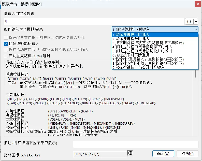 也可以模拟按键,比如按下鼠标中键的时候输入「Q」,以彻底替代q这个按键。