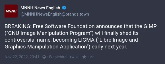 来自 MNNH News English 的报道称,自由软件基金会宣布,GIMP (“GNU Image Manipulation Program”) 不会再使用这个具有争议性的名称,将于明年初更名为 LIGMA (“Libre Image and Graphics Manipulation Application”)。