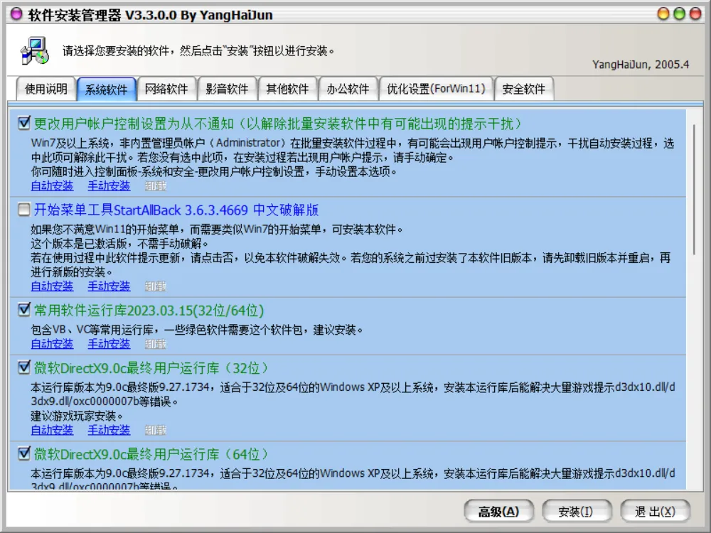 除了批量安装,也支持对单个软件的手动安装和自动安装,区别就是自动安装会在后台静默安装完成,而手动安装则需要人工完成软件的安装步骤。