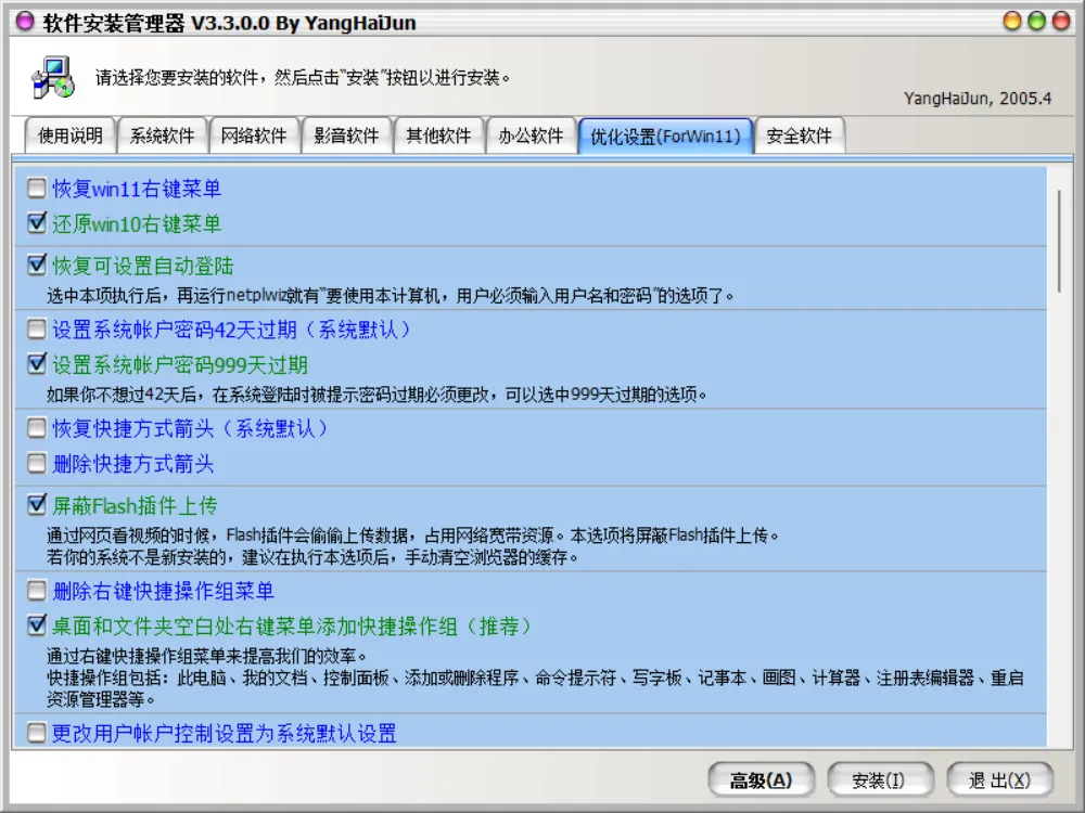 还有一部分推荐的优化设置,勾选需要安装的软件和设置,最后点击底部的「安装」便可一键批量安装所有软件和优化。