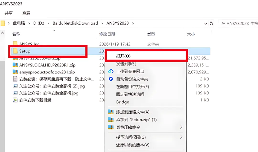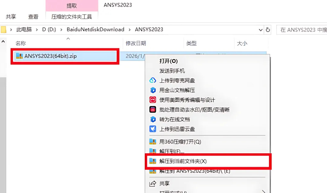1.下载ANSYS2023.R1软件安装包到电脑上,右键选择【解压到当前文件夹】。