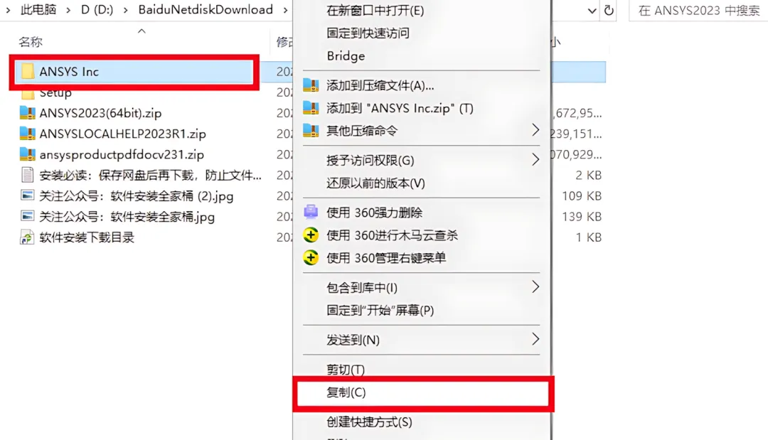 13.打开安装包解压后的【ANSYS2023(64bit)】文件夹,鼠标右击【ANSYS Inc】文件夹选择【复制】。