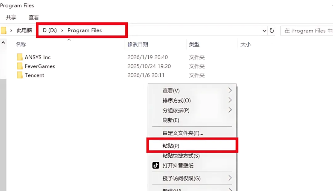 14.打开安装位置路径:D:\Program Files(若您在步骤7修改了其它磁盘,请打开对应的磁盘路径),鼠标右击空白处选择【粘贴】。