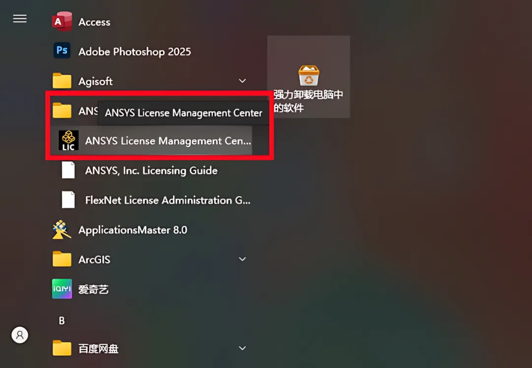 16.点击桌面任务栏中的【开始图标】,在所有应用中-点击【ANSYS License Management】文件夹-点击【ANSYS License Management Center】。