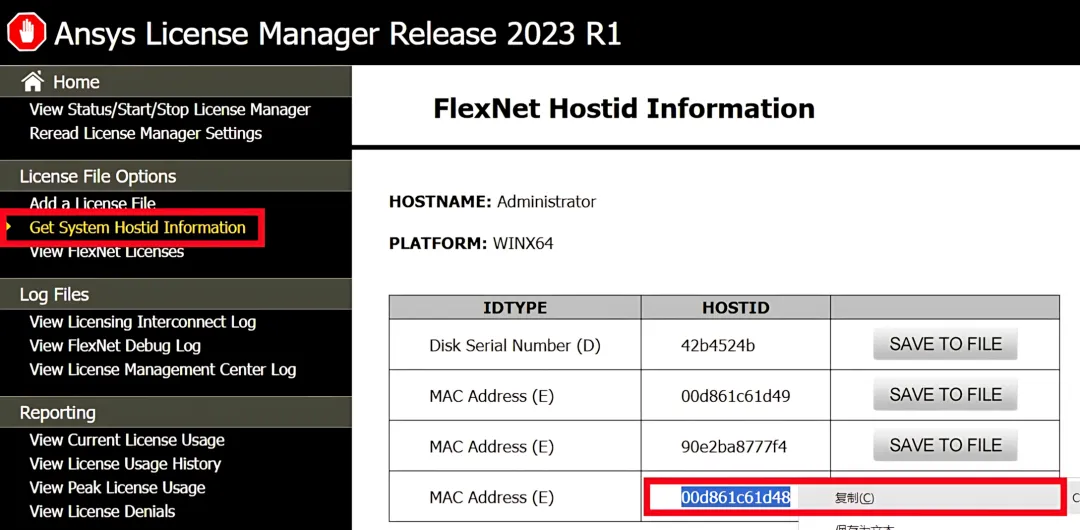 17.点击【Get System Hostid information】,鼠标右击“Mac Address”后的 【HOSTID】选择【复制】。