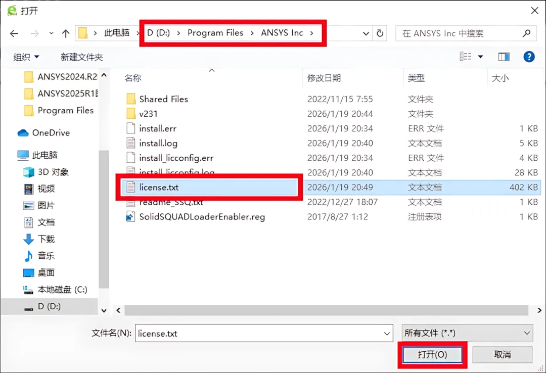 22.选择路径地址D:\Program Files\ANSYS Inc(若您在步骤7修改了其它磁盘,请打开对应的磁盘路径)中的【license】,点击【打开】。
